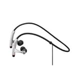 Earbud-style headphones deliver rich sound with deep bass. Lightweight active style headphones with a soft and flexible spiral behind-the-neck band. Cord adjuster lets you move the cord to the best position for sports or workout use. Moisture guard allows for moisture to pass around headphones. Single sided cord for sports usage. Short cord (2 feet) solution for arm-band use; extension cord (2 feet) is supplied. Three sizes of earbuds (S, M, L) allows a snug fit in a varity of ears sizes. Hard carrying case. Clip to secure the cord.